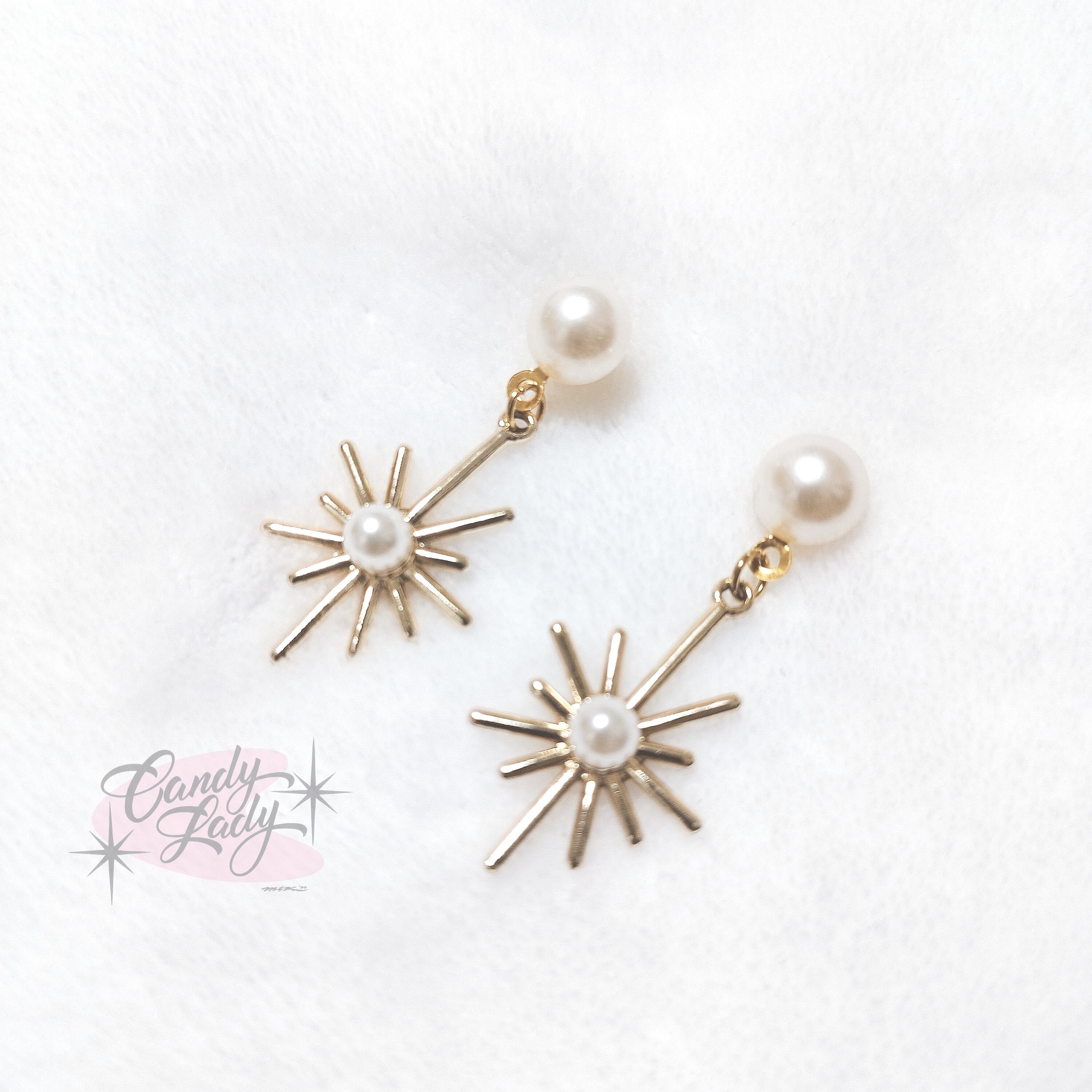 上質なパールがセンターに輝きを添え、周囲の星のようなデザインが存在感を放ちます。